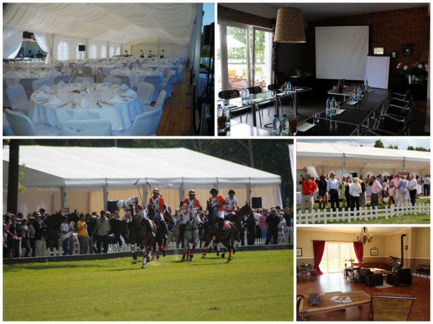 W budynku głównym mieszczą się szatnie, pokój klubowy oraz taras, z którego można obserwować przebieg rozgrywek. Przeszklona szerokimi, skierowanymi w stronę padoku i boisk witrynami sala konferencyjna o powierzchni 80 mkw. pomieści do 60 osób w ustawieniu teatralnym. Warsaw Polo Club uczestników spotkań ugości w 12 pokojach.