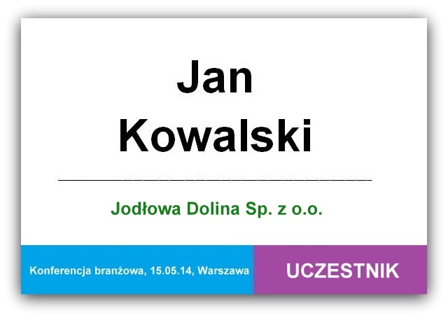 Najważniejszą informacją na identyfikatorze jest imię i nazwisko uczestnika. Szkoda marnować miejsce na nazwę i datę konferencji – każdy uczestnik wie, gdzie się znajduje.