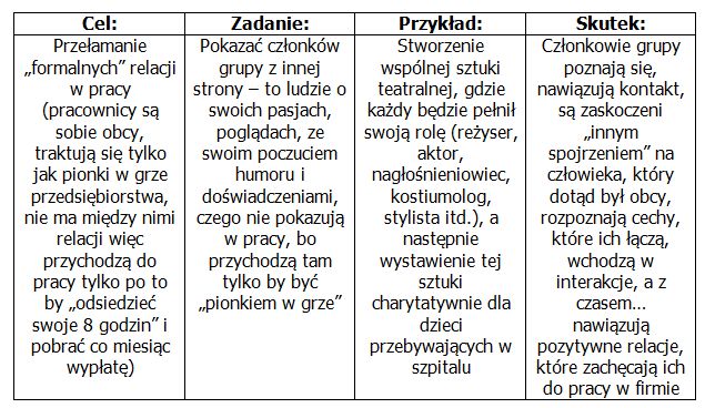 Wśród celów teambuilding najczęściej spotykanymi są: poznanie się zespołu, który ma ze sobą działać w dłuższym okresie czasu, nabranie zaufania pomiędzy członkami grupy, określenie mocnych i słabych stron (wad i zalet / talentów i lęków) członków grupy, stworzenie przyjaznej i relacyjnej atmosfery w grupie, rozwiązywanie problemów grupowych (np. „czarna owca” w grupie, zazdrość i zawiść, czy też często pojawiające się plotkowanie o innych członkach), kreowanie relacji między dwoma (lub większą ilością) istniejącymi już grupami (np. 2 niezależne działy w firmie lub pracownicy dwóch zagranicznych oddziałów), i na koniec, niemniej także ważny cel: wytwarzanie zaangażowania i energii w pracy grupowej. Można więc metaforycznie powiedzieć, że teambuilding w stosunku do firm (a taki najczęściej się zdarza) ma na celu stworzenie sytuacji, w której pracownik chętniej chodzi do pracy – a jeśli chodzi chętniej, to pewnie też lepiej wykonuje swoje zadania. To jeszcze nie było takie trudne, choć od wyznaczenia konkretnych celów rozpoczyna się planowanie każdego eventu teambuildingowego. Teraz najważniejsze pytanie brzmi: jak to osiągnąć? Otóż sukcesem dobrego teambuilding jest zastosowanie takiej tematyki eventu, aby działania grupy wywołały realne odczucie określonych emocji i obserwacji. Jeśli na przykład chcemy, żeby członkowie grupy bardziej sobie zaufali, to dobieramy taki temat, który to wymusi w sztucznych i narzuconych warunkach – np. wspólne przejście po linie rozwieszonej pomiędzy dwoma drzewami, gdzie uczestnicy są ze sobą powiązani czy też zjazd tratwą wzdłuż wartkiego strumienia. Nie wystarczy jednak samo doświadczenie emocji (i to jest podstawowy błąd firm, nierozumiejących teambuildingu). Emocje te trzeba także zrozumieć i przenieść na grunt pracowniczy! Po to właśnie na evencie potrzebny jest psycholog, by pod koniec zadania spotkał się z grupą i zadał kilka podstawowych pytań: Jak się wtedy czułaś/eś? Co pomogło ci przezwyciężyć lęk? Co było dla ciebie nowym doświadczeniem? Czy przeżycie tego uczucia wzbogaca twoją osobowość? Jak możesz to wykorzystać w pracy? I najważniejsze: co możesz zrobić jutro (w najbliższy dzień, kiedy wejdziesz do swojej pracy i grupy), by odczuwać podobne emocje w swojej grupie? Ludzie podczas zadań teambuildingowych odczuwają konkretne emocje, doświadczają bardzo określonych uczuć (zaplanowanych przez nas i właśnie tych, które chcemy wywołać). Dobrze przeprowadzony teambuilding daje nam taką możliwość w obecności osób z naszej grupy, ale nie tylko tych ludzi, których lubimy, ale i tych, których lubimy mniej lub nawet nienawidzimy. Przy przejściu po linie zawieszonej między drzewami okazać się może, że takie samo zaufanie mamy do szefa, jak i do jego sekretarki – dlaczego? Bo wisząc 10 metrów nad ziemią, nie mamy wyboru! Jesteśmy zdani na innych ludzi i zaufanie pojawia się automatycznie i autonomicznie. A jeśli zadanie zostanie wykonane (to też ważne dla organizatora eventu), to warto porozmawiać o tych emocjach – okazuje się, że są one możliwe i że nie niszczą nas, a wręcz przeciwnie – wzmacniają i budują. Po powrocie do pracy dajemy sobie więc szansę, żeby takie emocje odczuć, w mniejszym już stopniu co prawda, ale na co dzień. Po czasie okazuje się, że ufamy łatwiej i ufamy tym, którym wcześniej nie ufaliśmy. W tym momencie teambuilding spełnił swoją rolę i cel!
