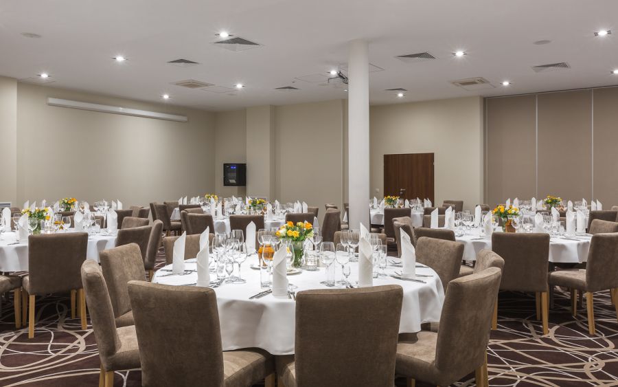 W budynku głównym, na poziomie -1, znajdują się 2 sale konferencyjne. Aby się do nich dostać, można zjechać windą lub wejść bezpośrednio od strony parkingu; w obu przypadkach do pokonania jest kilka schodków. Sala konferencyjna A (90 mkw.) pomieści 80 osób w układzie teatralnym, a większa, sala B (180 mkw.) – 230 uczestników szkoleń. Obie sale są klimatyzowane, dzięki systemowi ścianek działowych można je połączyć w jedną przestrzeń o powierzchni 270 mkw., w której podczas bankietu zasiądzie 160 gości. Sale są przesunięte względem siebie, jednak przy odpowiednim rozplanowaniu miejsc siedzących wszystkim uczestnikom wydarzenia zostanie zapewniona pełna widoczność. We wnętrzach tych dominuje neutralna kolorystyka, różne odcienie brązu, przełamane żółtymi akcentami. Podłoga wyłożona jest parkietem, na którym została położona wykładzina, na suficie zamontowano kinkiety. Do stałego wyposażenia należą: ekran, wbudowany system nagłośnieniowy, projektor multimedialny i mikrofony bezprzewodowe. Przy wejściu do sali B, za kolumnami wydzielona jest część na przerwę kawową lub bufet. Można także wykorzystać hol bezpośrednio przed wejściem do obu sal.