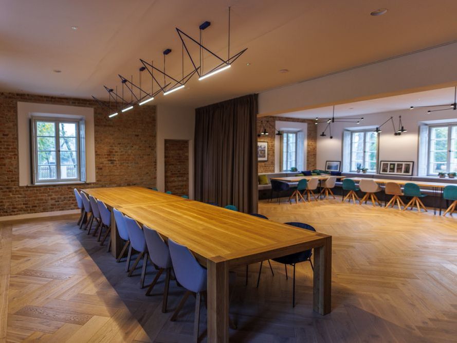 Drugą z oferowanych przestrzeni jest sala konferencyjno-jadalniana, o tym samym metrażu co Oficyna, i doskonałym doświetleniu dzięki licznym oknom. Salę przedzielić można kotarą na dwie części i w jednej zaplanować warsztaty, w drugiej zaś przygotować przerwę kawową.