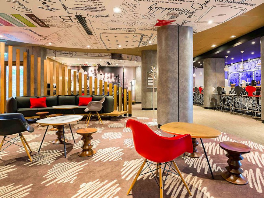 Po przekroczeniu progu wchodzimy... No właśnie. Wszystko zależy od tego, który próg przekroczymy. Obiekt ma bowiem dwa oddzielne wejścia i dwie recepcje – jedna prowadzi do trzygwiazdkowego hotelu ibis, druga do mogącego pochwalić się jedną gwiazdką więcej – Novotelu. Zacznijmy od tego pierwszego. Po wejściu do recepcji ibisa widzimy przestrzeń urządzoną w radosnym i młodzieżowym stylu, typowym dla tej marki, tu w najnowszym jej wydaniu – pod nazwą Avanzi. Recepcja z 3 stanowiskami, obok bar i kilkanaście miejsc do odpoczynku. Za nimi restauracja (śniadaniowa na około 60 osób, gdzie co dzień rano podają świeżą szarlotkę!) i przejście do części konferencyjnej. Po drodze mijamy jeszcze szatnię i centrum fitness. Ot, dobry standard, do którego jesteśmy przyzwyczajeni w sieci ibis.