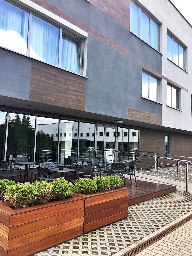 Otwarty w kwietniu 2017 r. WAW hotel to budynek minimalistyczny, nowoczesny, i – tak jak same wnętrza – utrzymany w bieli i szarościach, z drewnianymi akcentami na elewacji. Przed budynkiem jest mały ogródek letni, który na co dzień mieści 4 okrągłe stoliki po około 6 osób. Na prawo od głównego wejścia znajduje się recepcja hotelu, na lewo lobby z wygodnymi czarnymi, skórzanymi fotelami i samoobsługowym kącikiem kawowo-herbacianym. Na tym samym piętrze znajdują się pokoje, winda, szatnia dla gości konferencyjnych oraz schowek na bagaże. Miejsce to dostosowano do potrzeb osób niepełnosprawnych (podjazd przed budynkiem, przestronna winda, łazienka dla osób poruszających się na wózkach na 2. piętrze, gdzie znajduje się sala konferencyjna).