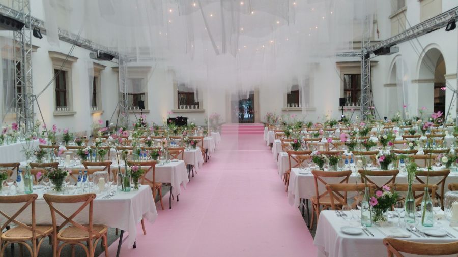 Naszą wizytę w obiekcie zacznijmy od przestrzeni oferowanych w Zamku. Największą jest Dziedziniec – 650 mkw. – zadaszony przez większość roku, dodatkowo ogrzewany i wentylowany. Podczas koncertu czy uroczystej gali pomieści 450 osób, podczas bankietu zasiadanego – 300 gości. Pod otaczającymi Dziedziniec krużgankami (ponad 220 mkw.) można zaaranżować strefę chillout, ustawić stoliki bankietowe, sofy, a podczas targów – stoiska.