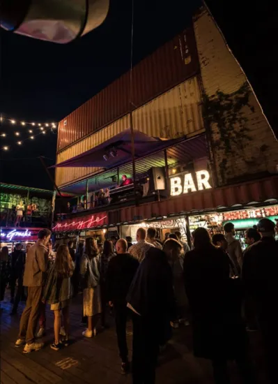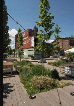 Architektura: oferta 100czni obejmuje przestronną halę (tzw. 100cznia Inside) oraz teren otwarty (100cznia Outside) z kilkunastoma lokalami gastronomicznymi, sceną koncertową, plażą miejską i galerią street artu. Obiekt łączy kontenerową architekturę z działalnością kulturalną i gastronomiczną. 100cznia Outside działa od maja do końca września, zaś 100cznia Inside - przez cały rok.