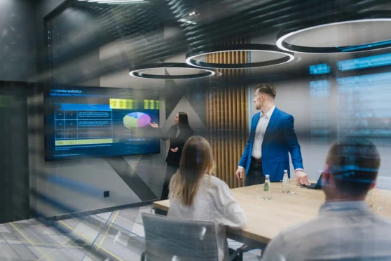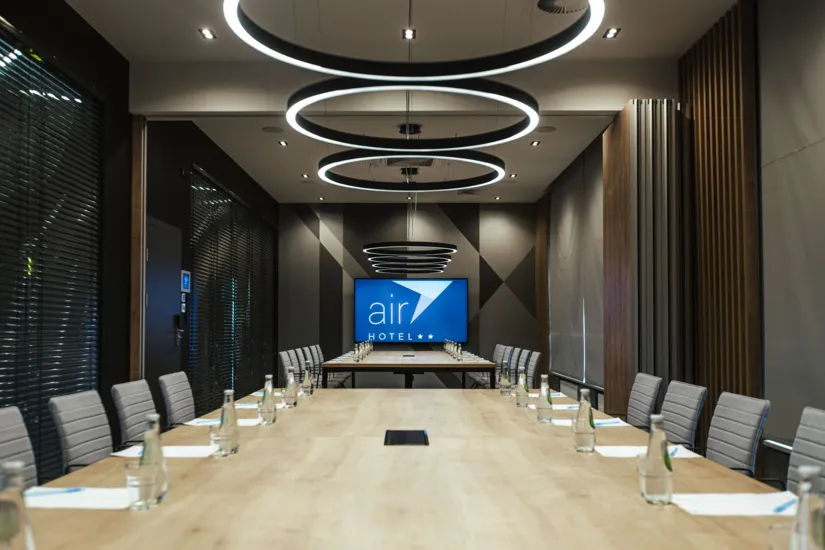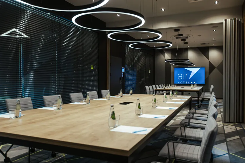 Elegancka sala na piętrze budynku. Oświetlenie jest regulowane i przyjemne dla wzroku, duże okna mogą zostać całkowicie zaciemnione.
