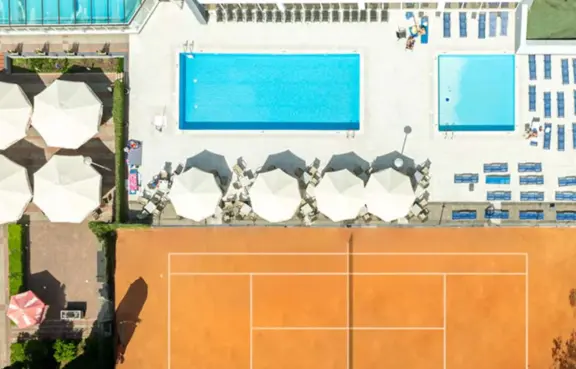 Architektura: wyremontowane dwupiętrowe centrum relaksu z basenem i kortem tenisowym.
