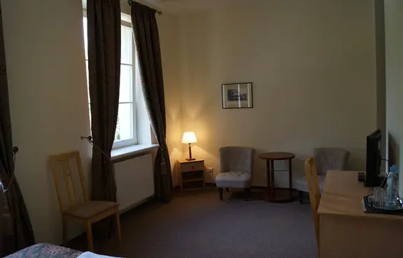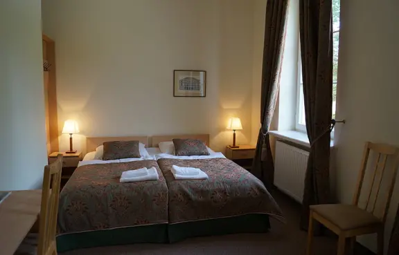 Pałac posiada 15 pokoi 1- i 2-osobowych z możliwością dostawki, łącznie – 36 miejsc noclegowych.