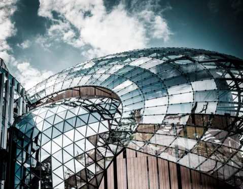 Architektura: charakterystyczna, kulista bryła sali koncertowej przylega do 6-kondygnacyjnego biurowca o klasie A.