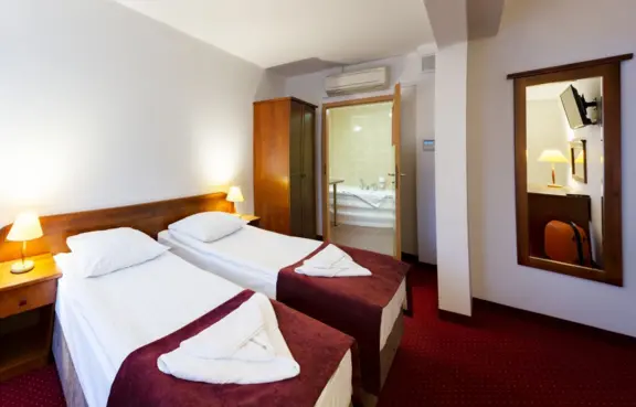 Pokoje: 176 miejsc noclegowych rozmieszczonych w 75 pokojach wyposażonych w Internet, klimatyzację, biurko, minibar oraz TV.
