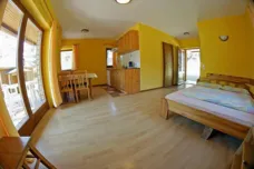 W naszych 24 domkach mamy ok. 110 miejsc noclegowych. W każdym z nich znajdziecie Państwo salon wyposażony w telewizor, łóżko małżeńskie, sypialnię dla dwóch osób oraz aneks kuchenny. W aneksie kuchennym połączonym z jadalnią można przygotowywać ciepłe posiłki – jest wyposażony w kuchenkę elektryczną, lodówkę i wszystkie podstawowe akcesoria kuchenne: zastawa stołowa, garnki, sztućce, etc. Każdy apartament posiada również łazienkę z kabiną prysznicową, umywalką i toaletą. Ponadto przy wszystkich domkach jest taras oraz komplet mebli ogrodowych.