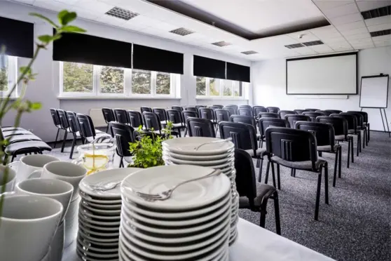Na wyposażeniu sali jest klimatyzacja, dostęp do światła dziennego, nagłośnienie, internet wi-fi, brak kolumn, projektor, ekran wbudowany, flipchart.