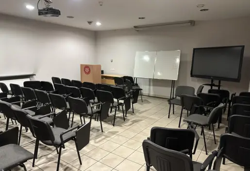 Na wyposażeniu sali jest nagłośnienie, internet wi-fi, projektor, tablica.
