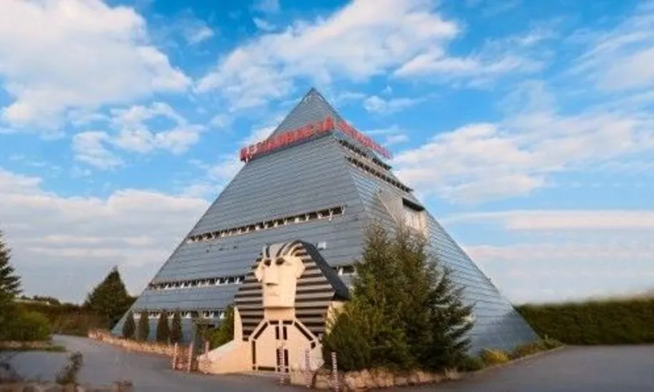 Charakterystyczny budynek stylizowany na egipską piramidę.