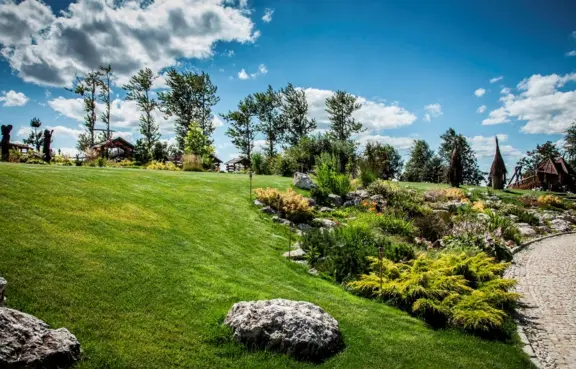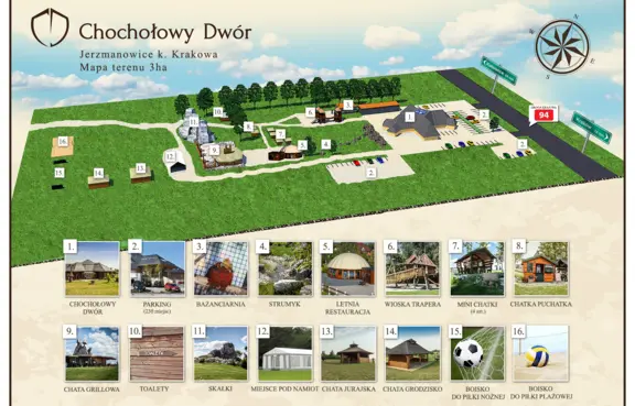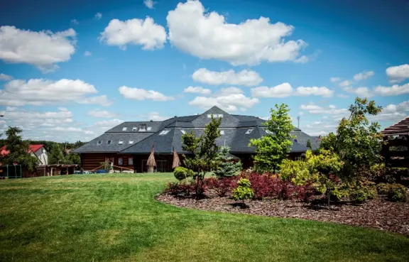 Ogród - o powierzchni 3 ha z chatą grillową i tarasem widokowym oraz dwoma mniejszymi chatkami, rozległą panoramą na Ostańce Jerzmnowickie oraz bajkowym placem zabawa dla dzieci, boiskami do plażowej piłki siatkowej i piłki nożnej oraz terenem do gry w paintball