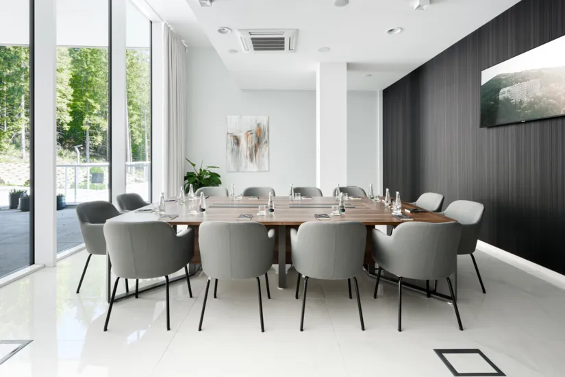Sala konferencyjna VIP 34m2, dedykowanej dla 12 osób, klimatyzowanej i z dostępem do światła dziennego.