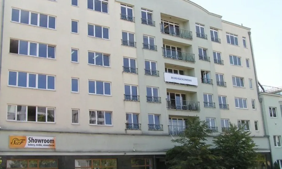 Pięciopiętrowy, murowany, budynek z beżową elewacją.