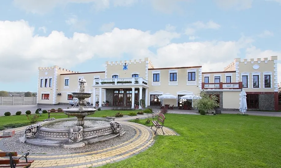 Sala Trzy Baszty to murowany budynek z jasną elewacją, natomiast Dworek Pan Tadeusz to budynek z czerwonej cegły z czarnym dachem.