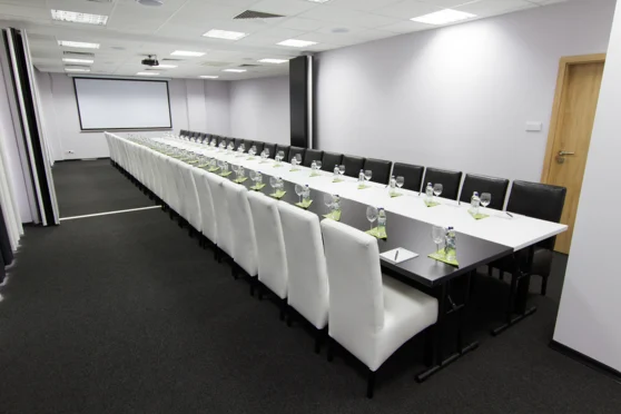 sala konferencyjna A+B jest wielkości ok. 90 m kw. i jest w pełni wyposażona w profesjonalny projektor multimedialny, nagłośnienie, ekran, flipchart, materiały biurowe, WiFi oraz klimatyzację.
