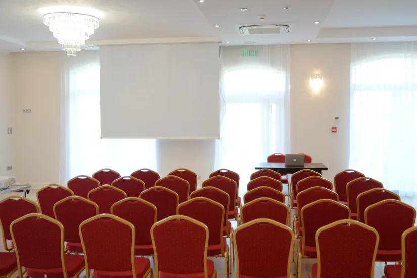 Na wyposażeniu sali jest klimatyzacja, zaciemnienie regulowane, dostęp do światła dziennego, nagłośnienie, internet wi-fi, scena / podest, projektor, ekran wbudowany, tv / monitor lcd, mikser audio.