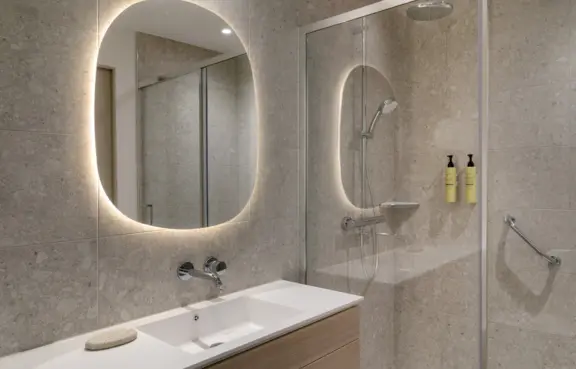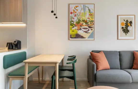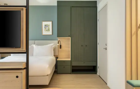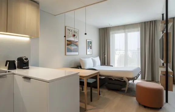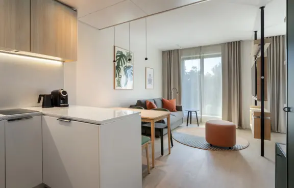 Obiekt oferuje 115 przestronnych pokoi typu studio o powierzchni około 33 m². Każdy z nich wyposażony jest w aneks kuchenny, część wypoczynkową oraz komfortową łazienkę. Wystrój wnętrz łączy nowoczesny design z naturalnymi materiałami, tworząc przyjazną przestrzeń zarówno do pracy, jak i relaksu.