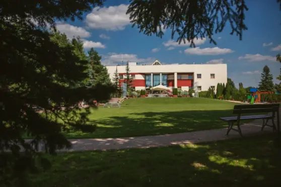 Architektura: piętrowy budynek o jasnej elewacji, z terenem zielonym.