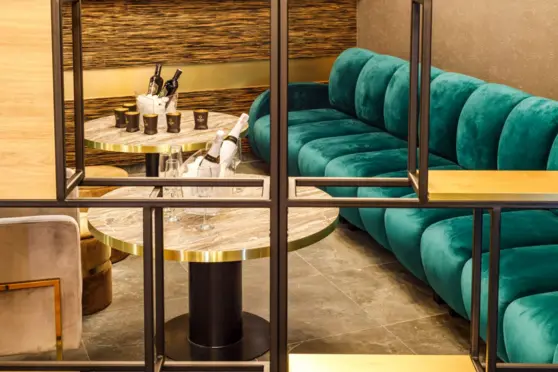 Architektura: Klub to elegancka przestrzeń utrzymana w odcieniach czerni, złota i zieleni.