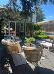 Architektura: nowoczesny budynek z przeszkleniami i strefą ogrodową.