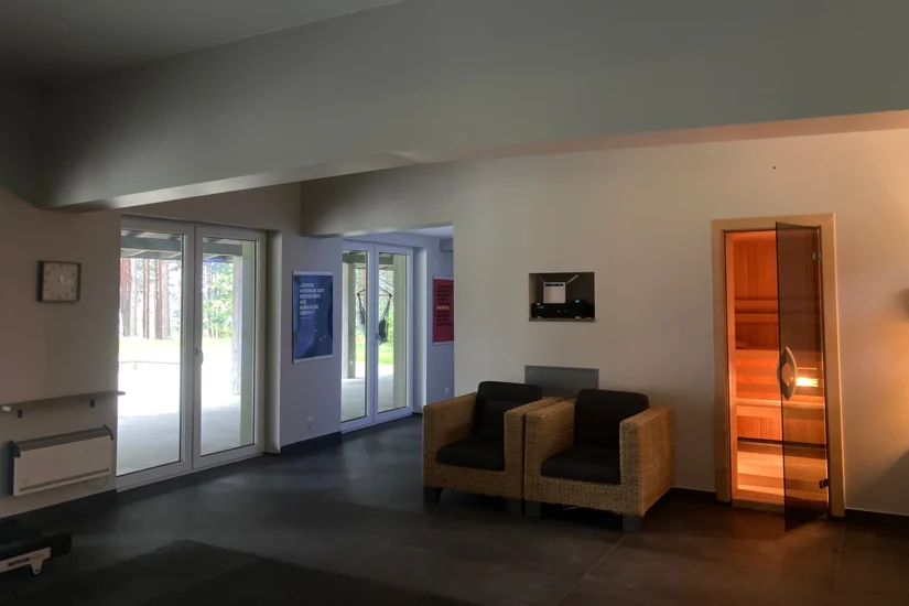 Sale konferencyjne: Góra Spokoju. Osada Klimatyczna-Leśna oferuje 3 niezależne sale konferencyjno-szkoleniowe, które przeznaczone są na spotkania dla od 10 do 60 osób. Sale wyposażone zostały w sprzęt audiowizualny, do tłumaczeń symultanicznych i maty do ćwiczeń.