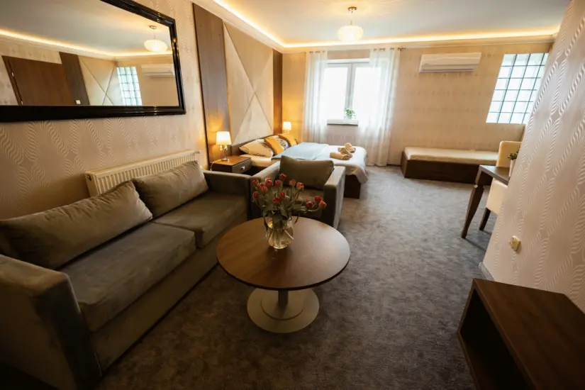 W ofercie znajduje się apartament z dużym łóżkiem małżeńskim, dodatkowym łóżkiem pojedynczym, kompletem wypoczynkowym oraz łazienką z wanną z hydromasażem, idealny do relaksu.