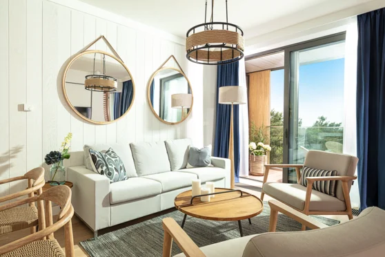 Pokój Junior w dwóch aranżacjach morskiej oraz naturalnej o powierzchni od 28 do 34 mkw zapewnia doskonałe warunki do wypoczynku. Idealny dla jednej lub dwóch osób, które mogą wybierać między jednym dużym lub dwoma pojedynczymi łóżkami. Przeszklona łazien