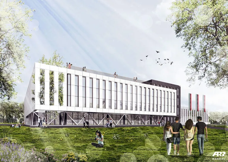 Architektura: Hala sportowa AGH to pięciokondygnacyjny, nowoczesny budynek z zielonym tarasem na dachu, o fasadzie w kolorach bieli, szarości i grafitu.