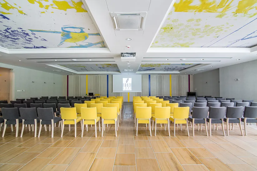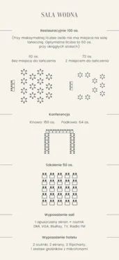 Sala wodna z możliwością przejścia na basen. Sala 182 m2. Sala może pomieścić do 200 osób. Częściowo przeszkolona z wyjściem na zewnątrz, wyposażona w rzutnik, ekran, system nagłośnieniowy. Klimatyzowana z możliwością wietrzenia i zaciemnienia.