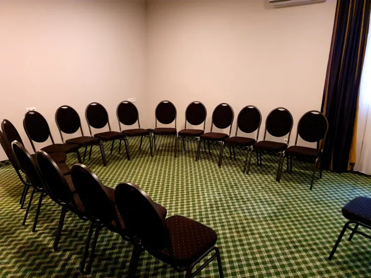 Kameralna sala o powierzchni około 30 m2, z dostępem do światła dziennego, mieszcząca się na piętrze, klimatyzowana, wyposażona w rzutnik, ekran, flipchart.