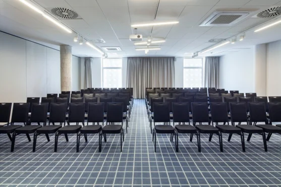 5 klimatyzowanych, modułowych sal konferencyjnych, mieszczących do 200 osób kinowo, wyposażonych w ekran, flipchart, projektor, dostęp do Internetu i TV.