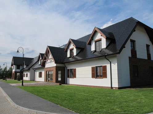 Nowoczesny, murowany budynek z jasną elewacją i czarnym dachem.