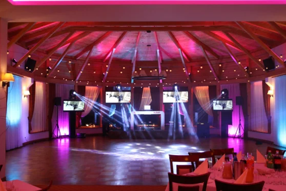 Sala została zaprojektowana tak, aby w każdym calu podkreślić wyjątkowość wyprawianych w niej przyjęć. Wystrój wnętrza łączy ze sobą piękno naturalnego drewna i eleganckich detali z nowoczesną technologią. Organizujemy zarówno duże przyjęcia w sali bankietowej (do 230 osób) jak i mniejsze przyjęcia dla kilkunastu osób w oddzielnej kameralnej sali.