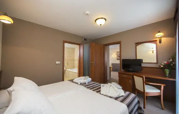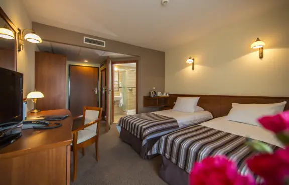 Ponad 200 miejsc noclegowych w 88 pokojach i 8 apartamentach wyposażonych w klimatyzację, Internet, TV, biurko, sejf, minibar oraz telefon.