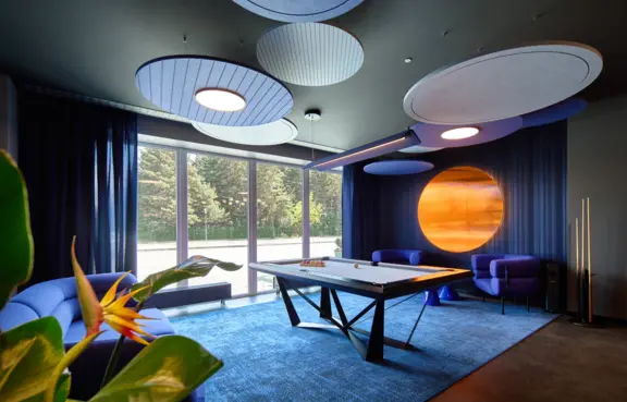 Architektura: Jednobryłowy, murowany budynek z jasną elewacją i płaskim dachem. Przestrzeń hotelowa inspirowana jest księżycem i w takiej kolorystyce utrzymana jest kolorystyka wnętrz.