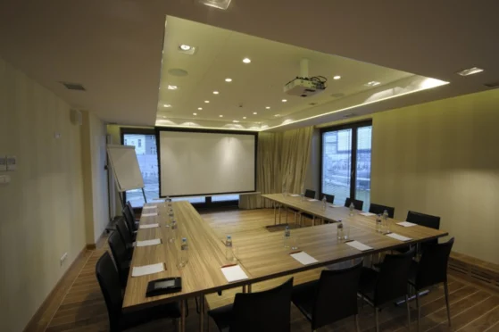 ekrany wbudowane w sufit, rzutniki multimedialne, nagłośnienie z mikrofonami bezprzewodowymi, flipcharty, Internet bezprzewodowy.