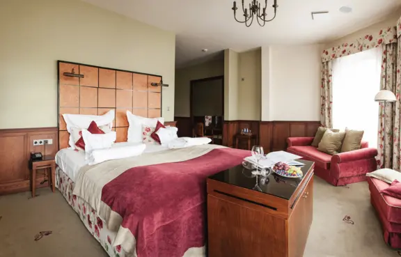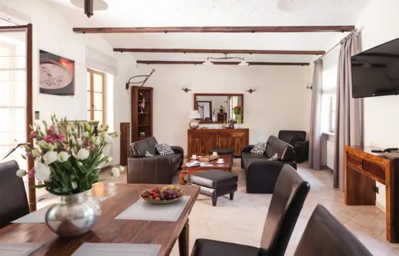 Pokoje: W budynku głównym 13 niepowtarzalnych pokoi dla 24 gości. W Villi Constantia są 4 miejsca noclegowe (dwa pokoje 2-osobowe oraz salon dzienny z aneksem kuchennym). Villa posiada prywatny ogród.