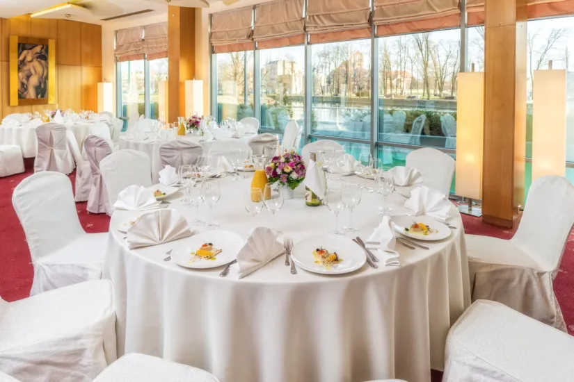 W czasie trwania konferencji, na Państwa życzenie, hotel przygotuje poczęstunek w postaci przerwy kawowej z ciastem prosto z hotelowej cukierni, wyśmienity lunch serwowany w restauracji z widokiem na Odrę, kolację integracyjną lub uroczysty bankiet z oprawą muzyczną i atrakcjami.