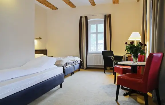 Pokoje urządzone są tak, aby niczego Państwu nie brakowało. Proste, przestronne i komfortowe wnętrza zachęcają do relaksu. Do wyboru są pokoje dwu lub trzyosobowe. Jeśli przyjadą Państwo do nas z rodziną lub przyjaciółmi, zaproponujemy apartament typu studio – dwa niezależne pokoje połączone systemem conectable. Dysponujemy także pokojami o podwyższonym standardzie.