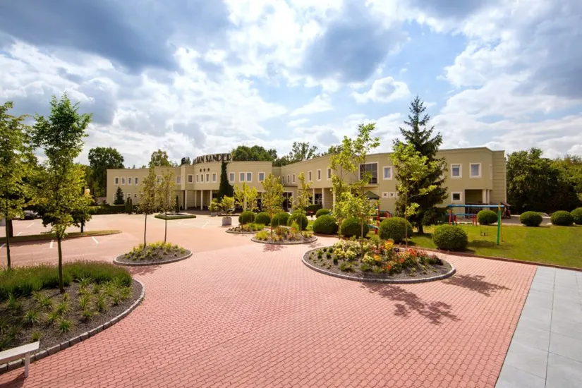 Architektura: kompleks hotelowo-konferencyjny zajmuje piętrowy budynek o jasnej elewacji. Hotel otacza zadbany, zielony teren.