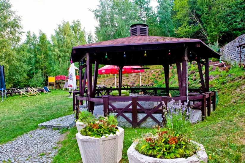 Architektura: Kameralny hotel w zielonym otoczeniu, z ogródkiem, altaną grillową i placem zabaw.