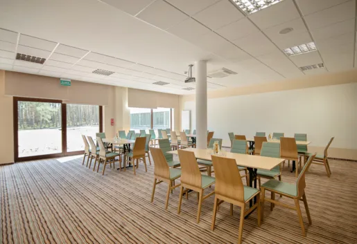Sala konferencyjna położona na II piętrze o powierzchni 230 m2 z możliwością jej podzielenia na dwie mniejsze sale. Dla zapewnienia komfortu uczestników sala zapewnia elektronicznie sterowaną klimatyzację oraz możliwość regulowania ilości d
