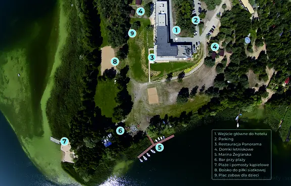 Na ponad 4 hektarach terenu hotelu są dostępne: plaża, pomosty kąpielowe, boiska do siatkówki, piłki nożnej, miejsce na ognisko, plac zabaw dla dzieci, parking, restauracja, bar, wypożyczalnia rowerów turystycznych, rowerów elektrycznych BIANCHI, kajaków, łódek wiosłowych oraz rowerków wodnych, deski SUP.