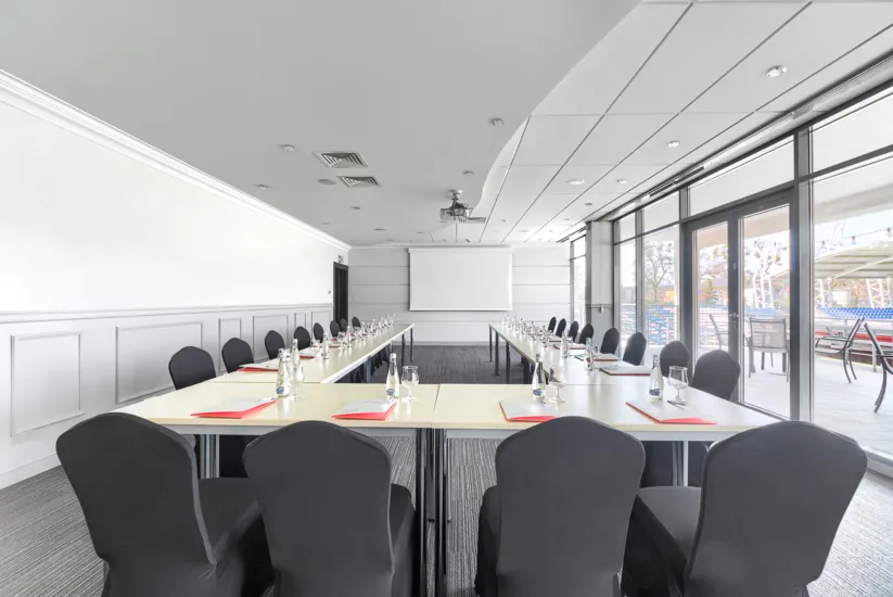 Sala znajdująca się na I piętrze. Wyposażenie: rzutnik, ekran, Wi-Fi, klimatyzacja, Flip chart, system BenQ, który pozwala na bezprzewodowe połączenie pomiędzy komputerem a rzutnikiem, taras. Widok na zieloną murawę pełnowymiarowego boiska piłkarskiego.