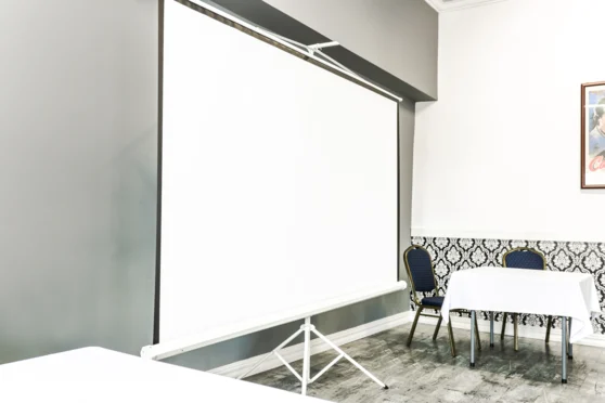 Na wyposażeniu sali jest klimatyzacja, zaciemnienie regulowane, dostęp do światła dziennego, nagłośnienie, internet wi-fi, brak kolumn, projektor, ekran wbudowany, flipchart, mikser audio.