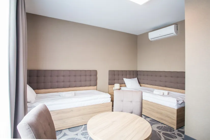 Pokoje: Zaplecze noclegowe Hotelu Rondo obejmuje 52 przytulnych i bardzo komfortowych pokoi w kilku standardach. Wszystkie pokoje są klimatyzowane i posiadają dostęp do bezprzewodowego internetu. Łącznie obiekt oferuje jednocześnie nocleg 110 osobom. Nowoczesne i przytulne wnętrza przypadną do gustu osobom ceniącym sobie wygodę i luksus. Pokoje są zróżnicowane, dlatego każdy znajdzie tu coś odpowiadajęcego swoim potrzebom. Każdy pokój wyposażony jest w klimatyzację, dostęp do Internetu, TV oraz biurko.